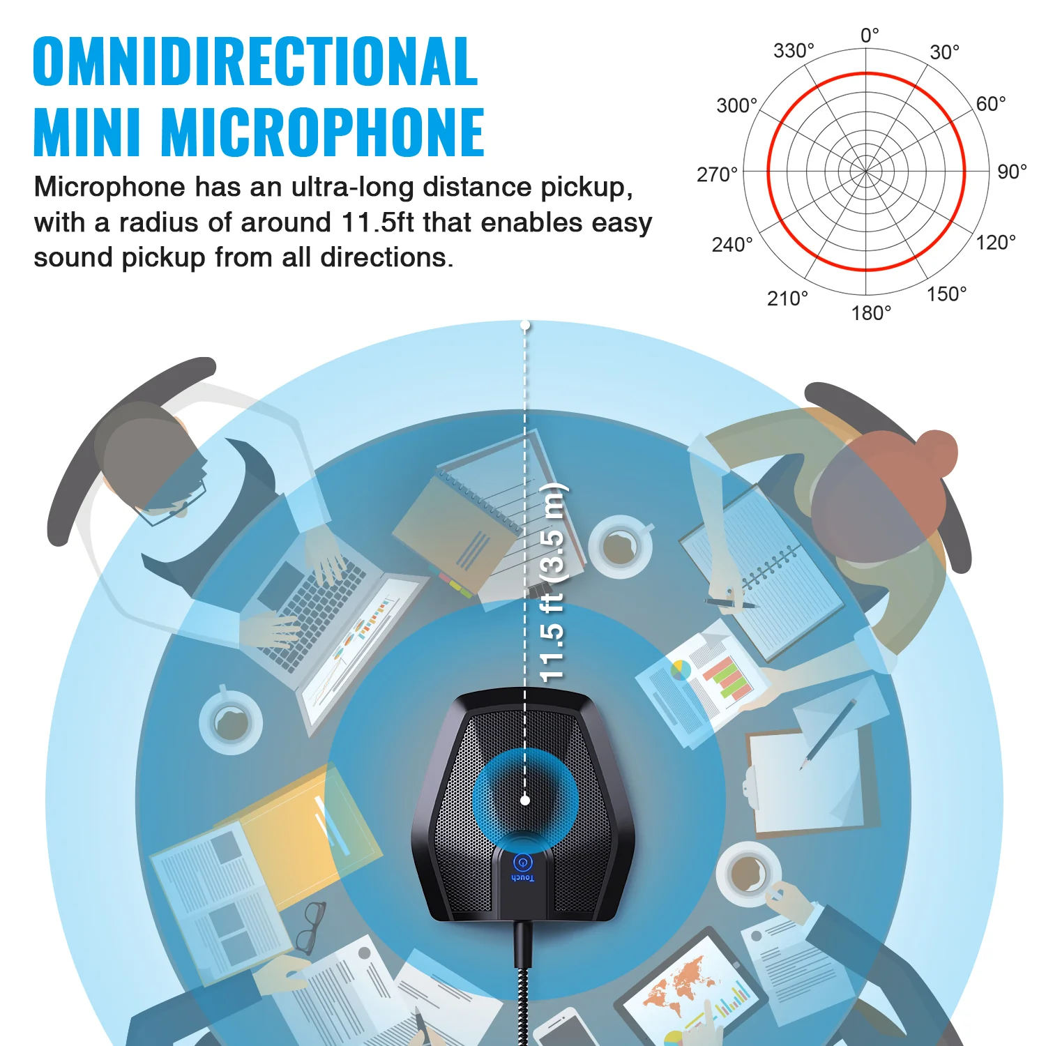 • Omnidirectional Microphone – It is not a Speaker or Speakerphone, it is a condenser microphone. The microphone has an omnidirectional pickup pattern with a pickup distance of 11.5 ft, making it easy to capture the most subtle sounds from 360° directions and transmit the sound more loud and clear. Participants can hear each other without raising their voices.